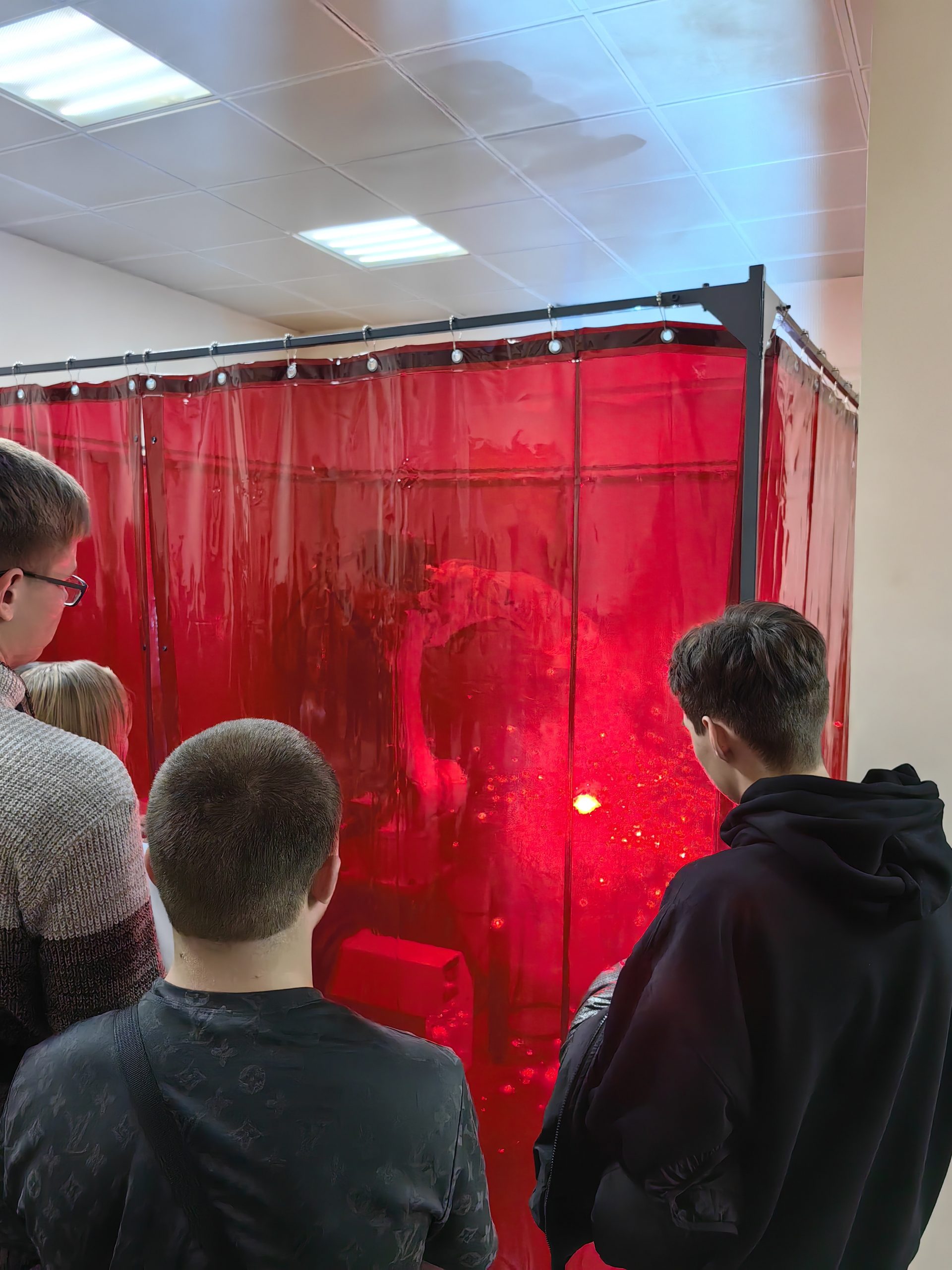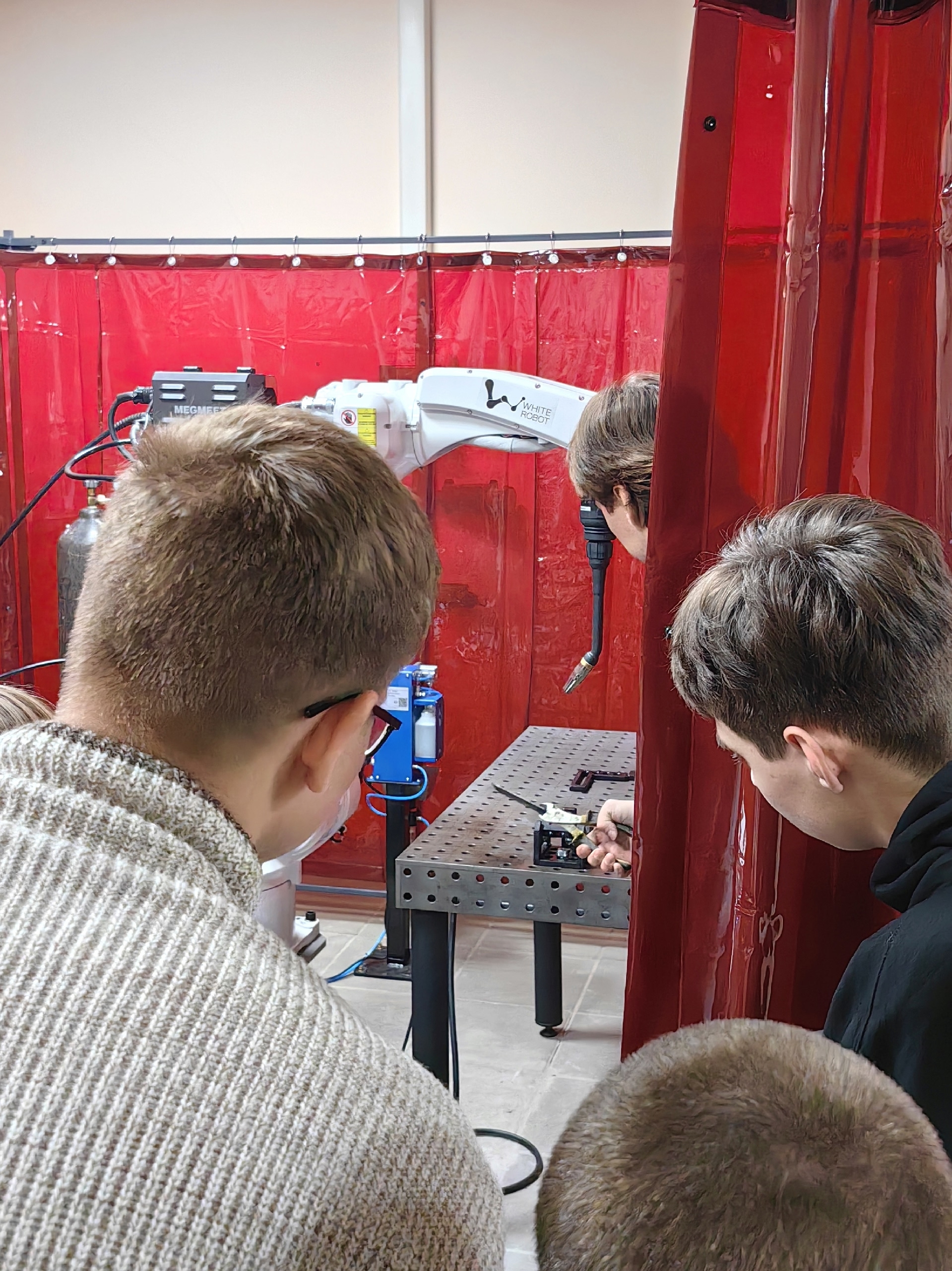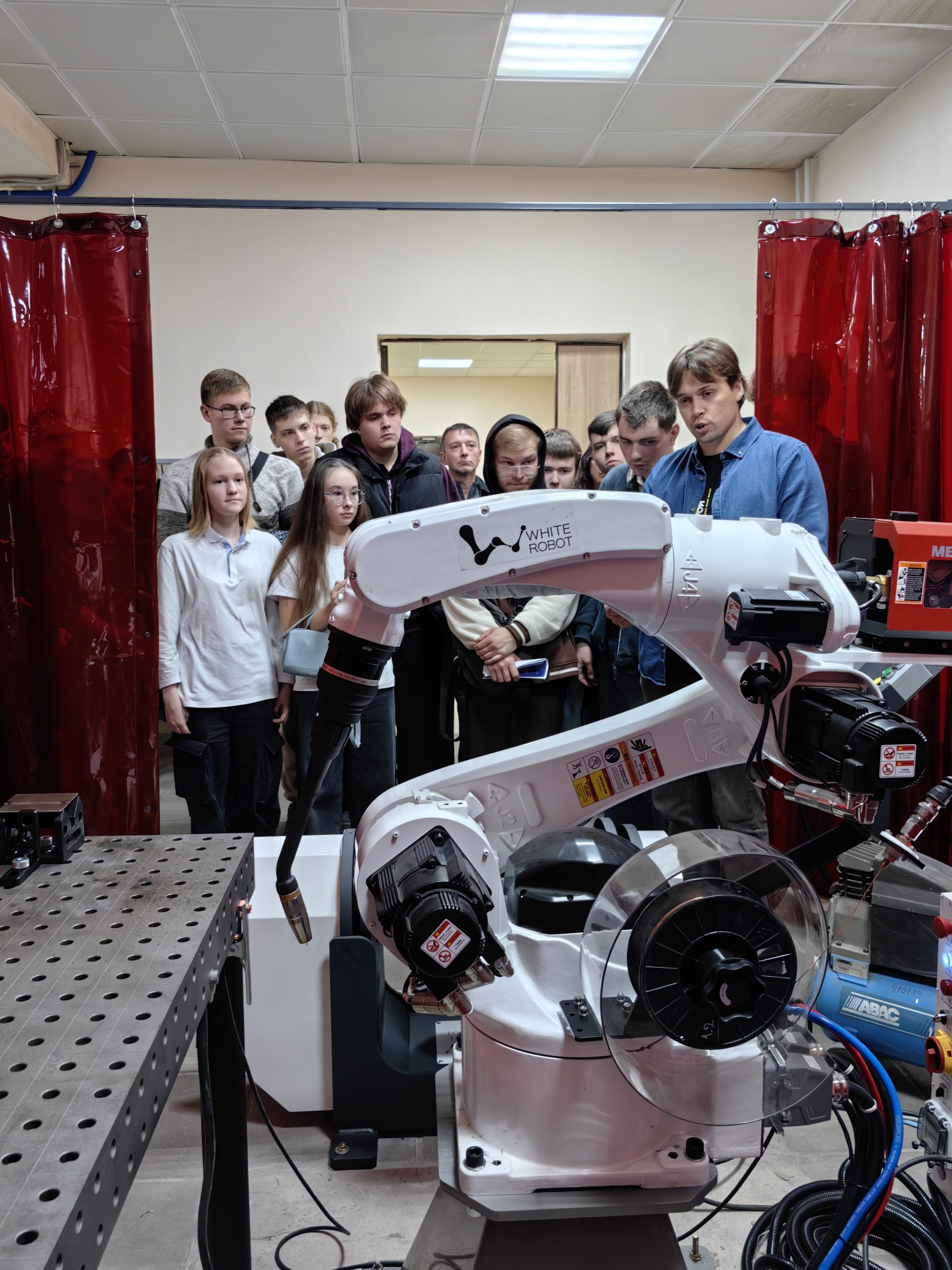 После вводной части абитуриенты разошлись по аудиториям и лабораториям кафедр ФТКМ. В лаборатории, посвященной сварке плавлением, доцент Сергей Елсуков провел мастер-класс по управлению 6-осевым сварочным роботом JH-605. Ученикам продемонстрировали фирменное приветствие от сварочного робота, а после чего с его помощью было сварено стыковое соединение. Данное оборудование вызвало огромный интерес у ребят: все хотели сфотографировать его и снять видео для себя и своих соцсетей.