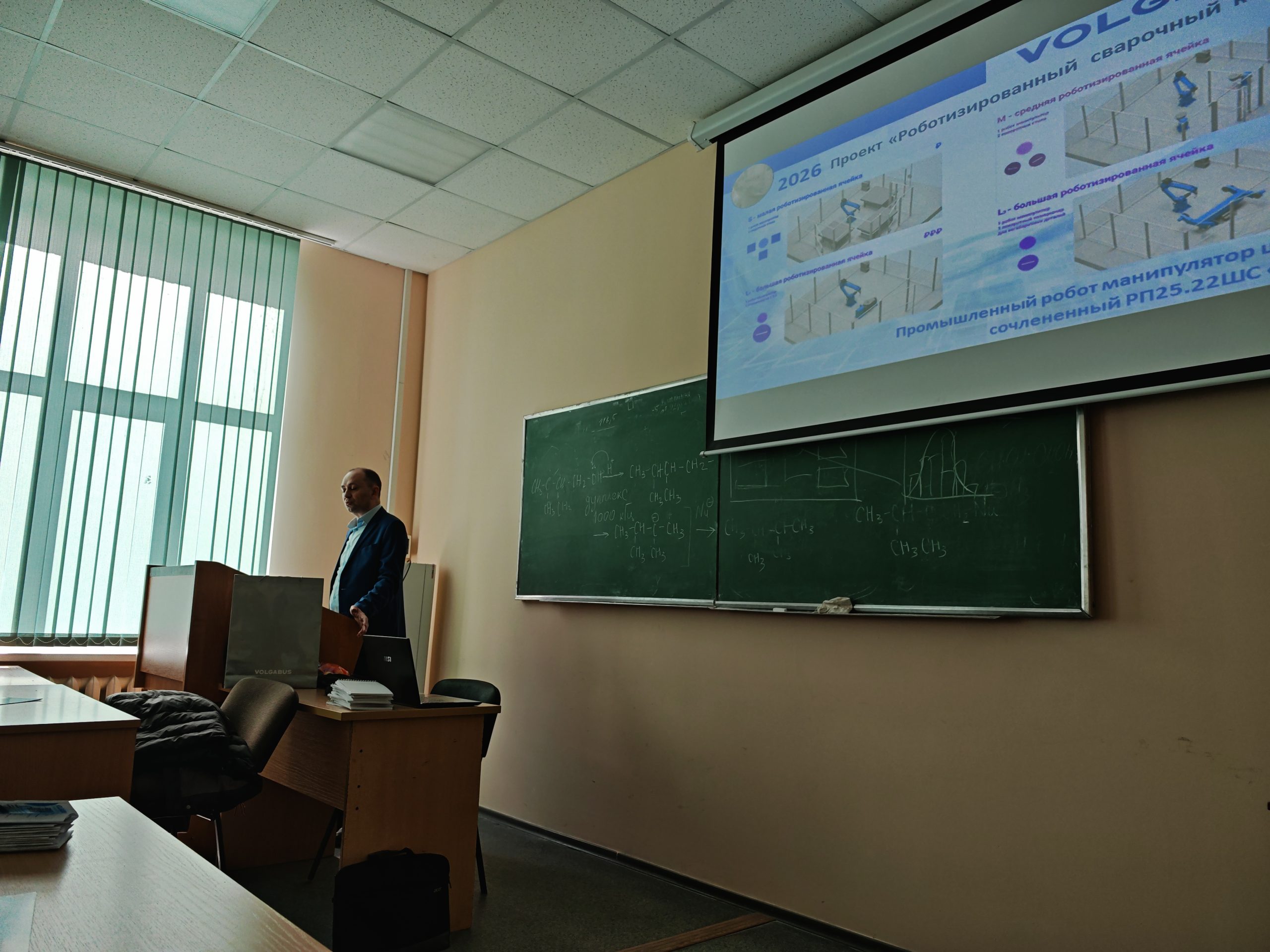 Другая часть выступления была посвящена технологическим аспектам производства. Александр Николаевич Михеев, как главный специалист по сварочным процессам «Волгобаса», рассказал студентам о специфике работы на предприятии. Особый акцент был сделан на модернизации производства: студентам представили информацию о новых роботизированных сварочных комплексах, которые внедряются в технологическую цепочку завода. Было отмечено, что для работы на современном высокотехнологичном оборудовании предприятию требуются квалифицированные операторы и инженерно-технические работники. Выпускники кафедры сварочного производства рассматриваются руководством завода как наиболее приоритетные кандидаты на эти вакансии.